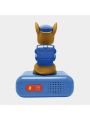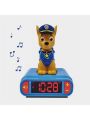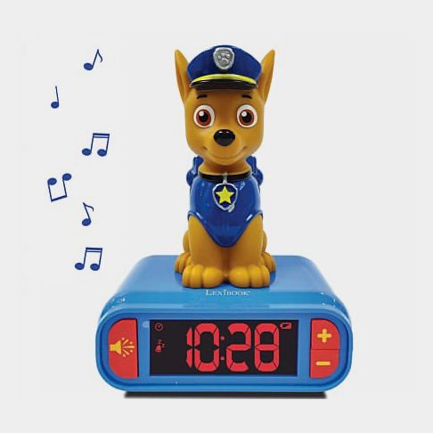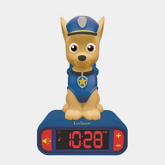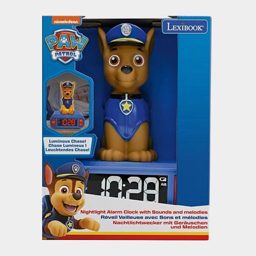 un design assez cool avec Chase qui s'éclaire pendant quelques minutes en appuyant dessus.écran LCD avec rétro éclairage, bouton pour déclencher des effets sonores de la Pat patrouille, alarmes avec choix de sonneries de l'univers de pat patrouille, Alimentation 3 piles AA/LR6(Non incluses).