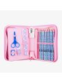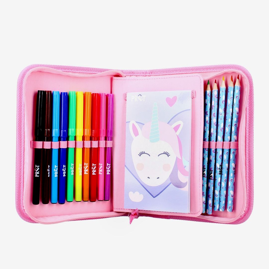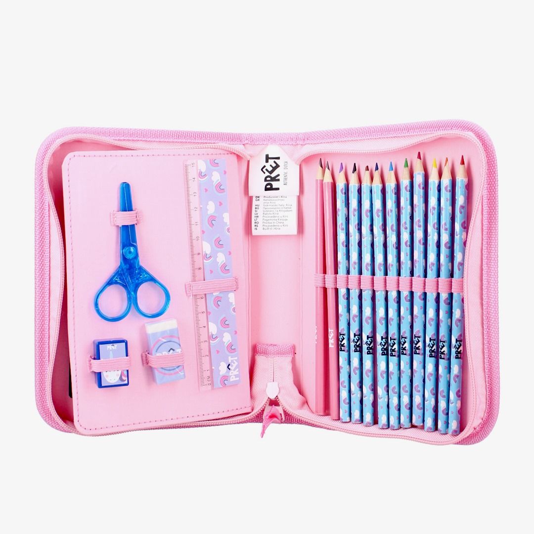 • Composition: 1 bloc note, 10 feutres de couleurs, 1 paire de ciseau, 1 règle, 1 taille crayon, 1 gomme et 12 crayons de couleurs.