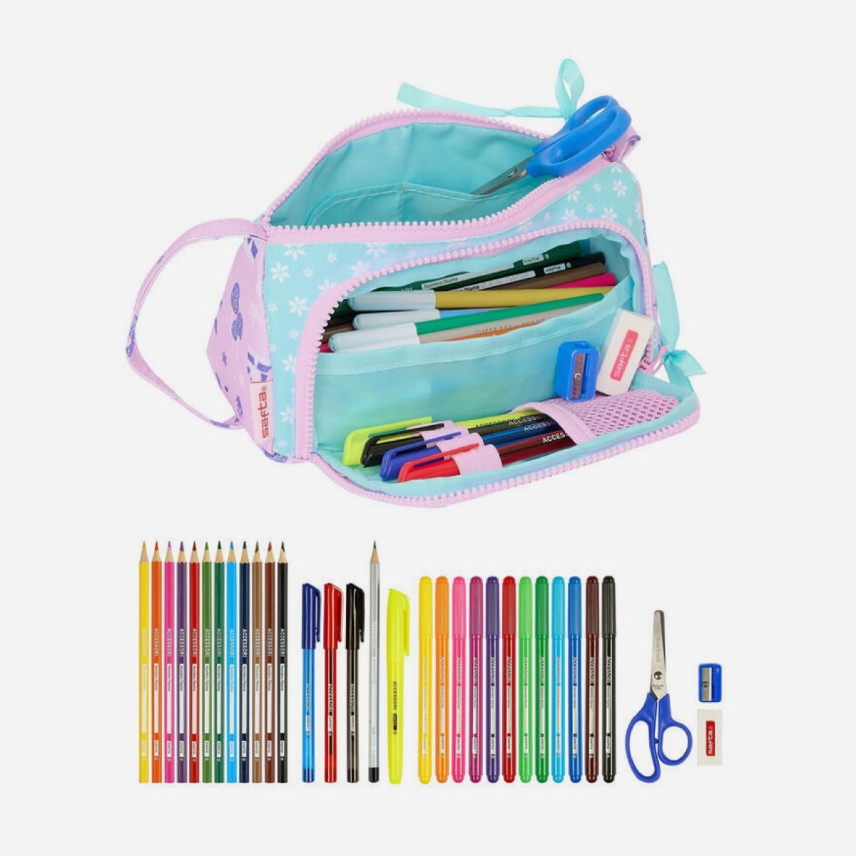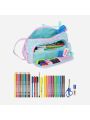 Composition: crayon graphite, ciseaux, taille-crayon, gomme, 3 stylos à bille, surligneur, 12 marqueurs de couleur et 12 crayons de bois.